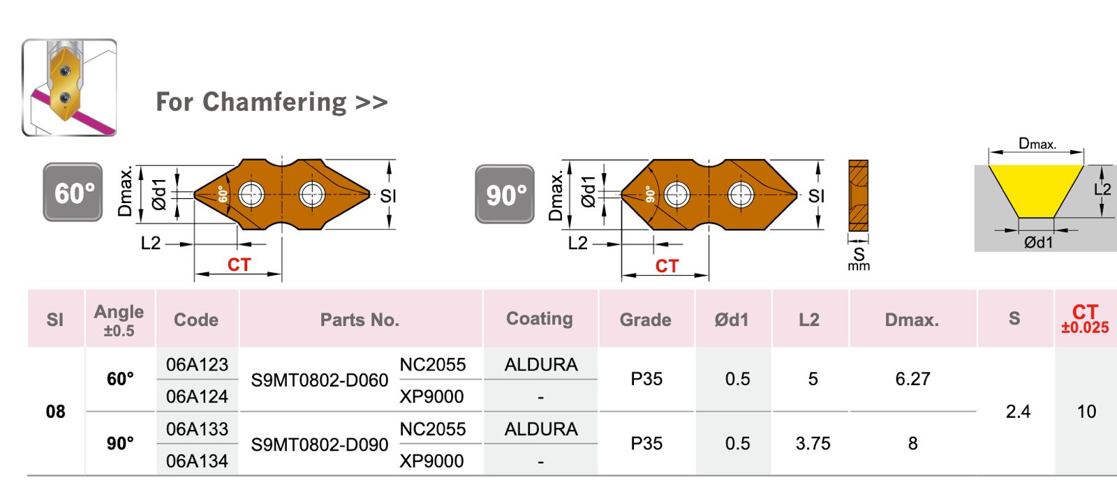 • Double point angle makes the insert tip stronger to prolong service life, which results in lower production cost.