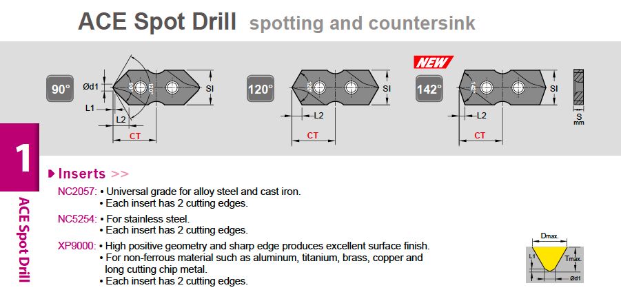 • Symmetric 2-flute edge design reducing the lateral force, it enhances ACE Spot drill rigidity enabling to run high feed rate.