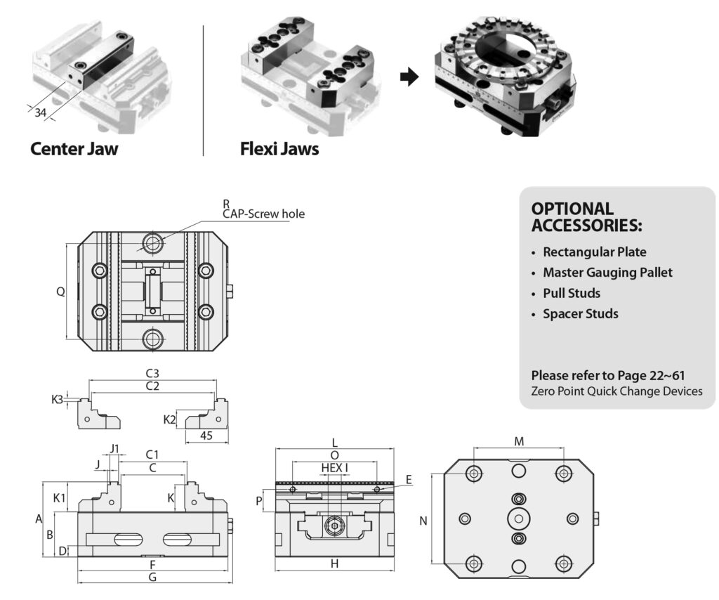 Constructed from top-grade tool steel (SCM440), the detachable jaws are carburized to achieve HRC55. Both sides are fixed size, providing a reliable datum and allowing users to reverse the jaws to increase the clamping range. This feature of the ASC-127x260M Five-Axis Self-Centering Vise ensures versatility and extended usability.